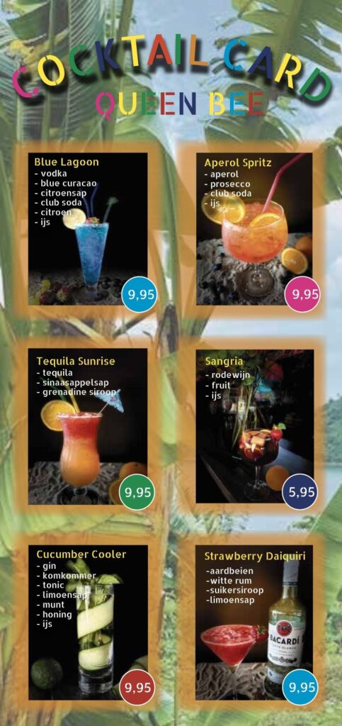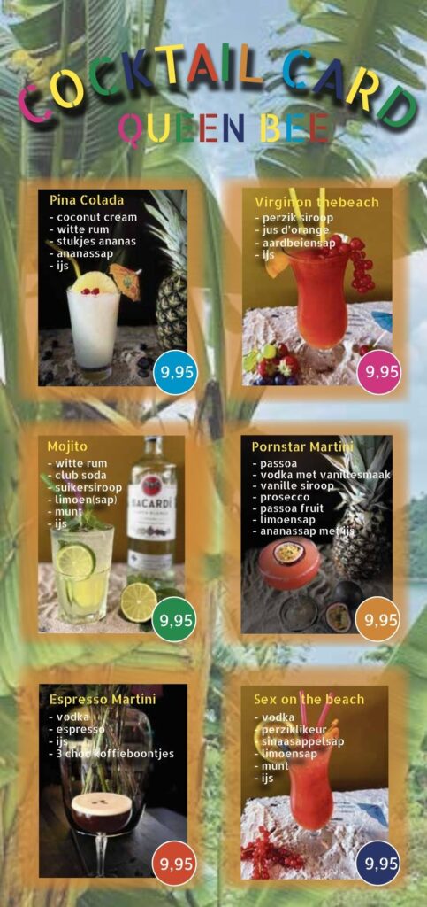 Komt U een lekkere cocktail bij ons drinken? Hier onder vindt U ons uitgebreide cocktail menu.